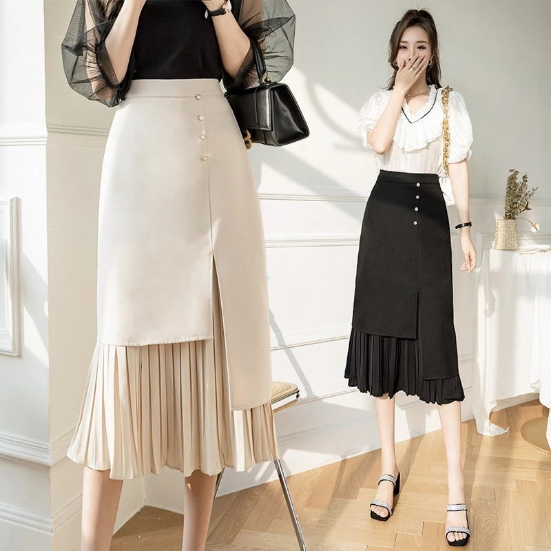 【送料無料】通勤OL スカート ボトムス ハイウエスト 不規則 レディース 美脚 黒 プリーツスカートミディアム丈 タイトスカート 春夏 ひざ丈